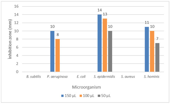 Test bacteria strains used in the study were Bacillus subtilis DSMZ 1971, Escherichia coli ATCC 25922, Pseudomonas aeruginosa DSMZ 50071, Staphylococcus aureus ATCC 25923, Staphylococcus epidermidis DSMZ 20044, Pseudomonas fluorescens P1, Salmonella typhimurium SL 1344, and Staphylococcus hominis ATCC 27844. The microorganism inocula were prepared under controlled conditions of correct incubation, with bacteria undergoing a 24-h incubation period at 37 °C, while yeasts were subjected to 48 h of incubation at 27 °C. Sterile saline solutions were carefully prepared for each microorganism, ensuring purity and consistency, and subsequently adjusted to the 0.5 McFarland standard to obtain uniformity in cell density across samples. Prepared according to the turbidity of the 0.5 McFarland standard, the concentration of viable cells within the test tube ranged from 1 × 107 to 1 × 108 colony-forming units per milliliter (cfu/mL) [37]. The disk diffusion test, a widely employed method, was used to evaluate antimicrobial activity [38]. The extract was applied onto 6 mm Oxoid antimicrobial susceptibility test disks at three doses: 50, 100, and 150 μL each. After application, the disks were air-dried for 8 h at 30 °C under sterile conditions to remove residual ethanol from the extract. Autoclaved, sterilized Mueller−Hinton agar (BD Difco, Franklin Lakes, NJ, USA) was poured into 90 mm sterile Petri dishes to achieve an average depth of 4.0 mm (±0.5 mm). Microorganism suspensions were evenly spread across the surface of the Petri dishes. Inside the biosafety cabinet, Petri dishes containing microorganism suspensions were allowed to air-dry for 5 min before disk placement. Disks were positioned on the agar surface within 10 min. Following completion of the test, Petri dishes were incubated at 37 °C for 24 h, and the diameters of the inhibition zones were measured in mm. Control discs, sterile and impregnated with ethanol, were utilized as negative controls in this study [35]. Prior to implementation, these ethanol-laden discs underwent exact drying under aseptic conditions to ensure the complete removal of ethanol residues.