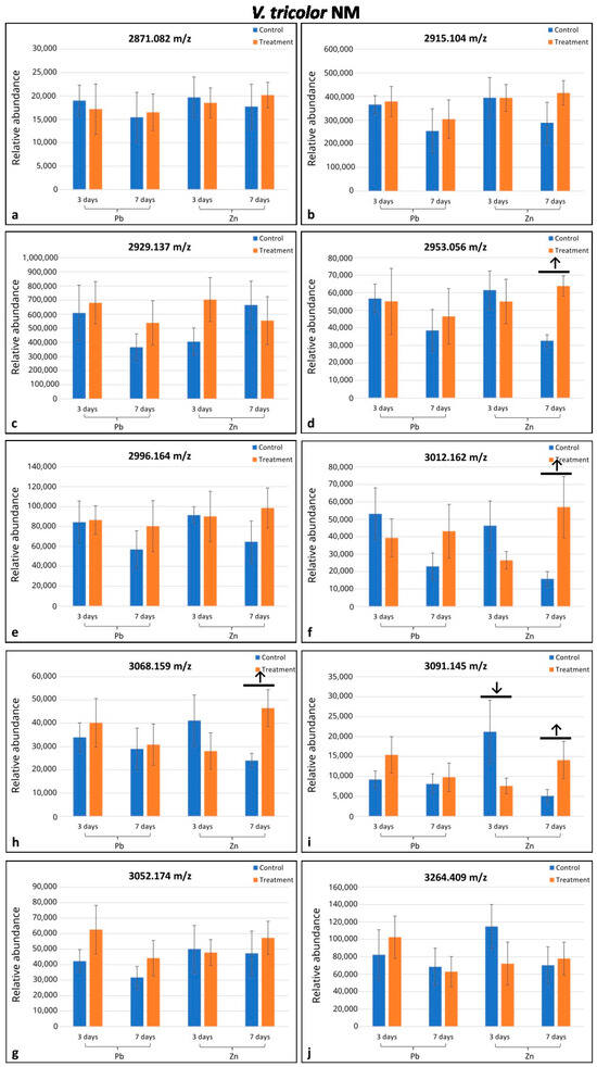 Comparison of mean relative quantities of cyclotides between specimens of Viola tricolor from non-metallicolous (NM) population treated with 1000 μM Zn or Pb for three and seven days and non-treated controls. Arrows indicate statistical differences (p < 0.05) by Student’ t-test. Means and standard deviations established based on N = 5 replications. Subfigures (a–j) represent changes in the level of cyclotides of different molecular mass as indicated above each diagram.
