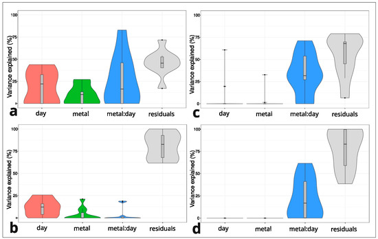 Violin plots representing a comparison of the explained variance in factors (day of treatment and metal dose) in Viola tricolor individuals derived from the non-metallicolous (NM) and metallicolous (M) populations treated with 1000 μM Zn or Pb for three and seven days and the non-treated controls. Pb M (a), Zn M (c), Pb NM (b), Zn NM (d). Analysis was performed for every single cyclotide.