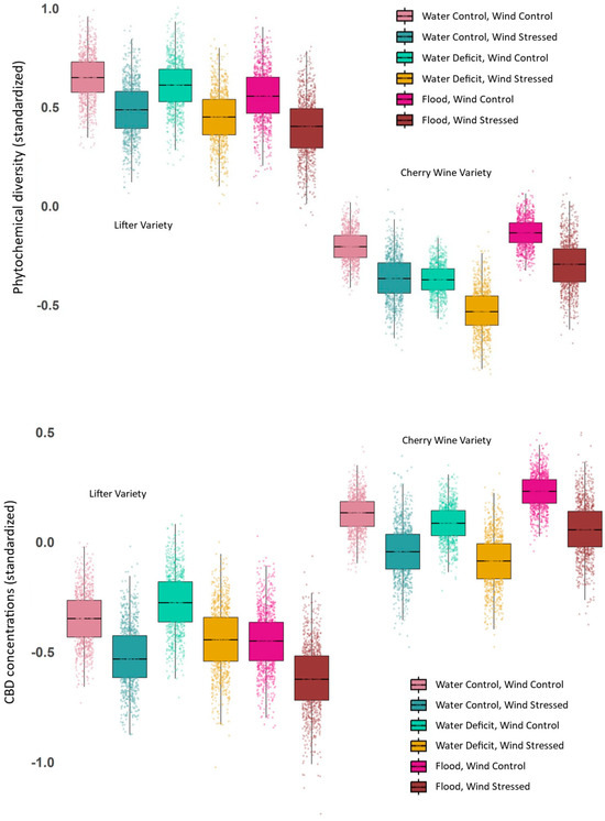 Bayesian estimates of medians and variance for standardized phytochemical diversity and CBD concentrations. Observed phytochemical diversity and CBD concentrations across hemp varieties and water treatments. Both response variables for standardized diversity (Simpson’s index, q = 2) are reported for Cherry Wine (C) and Lifter (L) clones under water deficit, control, and flood treatments. Variety had the largest effect on phytochemical diversity, with L plants showing consistently higher diversity. Stress effects (water deficit and wind stress) increased diversity across both varieties. Variation was estimated with a simple Bayesian approach, and boxplots and points are from a random sample of 1000 points from posterior distributions.