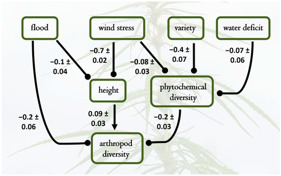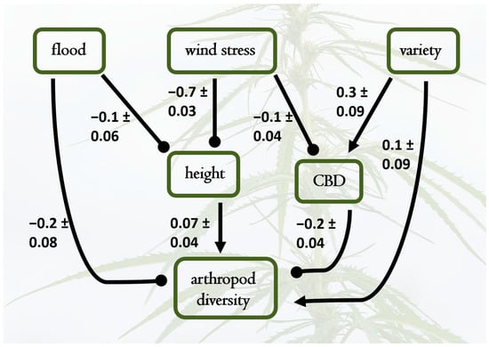 Best-fit structural equation model results depicting causal relationships among water treatments (flood and wind stress), plant height, plant variety (representing a shift from Lifter to Cherry Wine), CBD concentration, and arthropod diversity. Pathways not included had negligible path coefficients and contributed to poorer model fit. Standardized path coefficients are shown, with standard errors of individual effect sizes; the overall model was a good fit to the data (X2 = 6.4, DF = 7, p = 0.4). Notable supported causal hypotheses include positive effects of plant height on arthropod diversity, as well as direct negative effects of flooding and wind stress on plant height and CBD levels. Plant variety also influenced CBD concentrations (higher in the Cherry Wine variety), which subsequently caused lower arthropod diversity. The overall effects of variety on arthropod diversity are minimal because the indirect negative effects via increased CBD in Cherry Wine counteracted the direct positive effects of variety (shifting to Cherry Wine) on arthropod diversity.