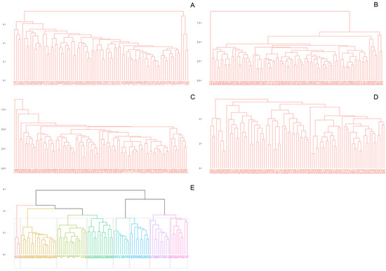 UPGMA trees reflecting optimal number of clusters using phenotypic traits. (A) P. durifolium. (B) P. ionanthum. (C) P. regnellii. (D) P. urvillei. (E) P. intermedium. Clusters within each tree are according to the k-means algorithm and indicated by different colors.