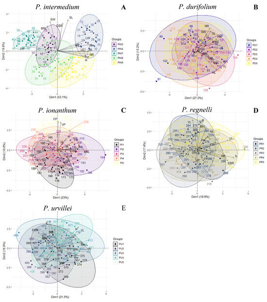 PCA analysis for each species using morpho-phenological traits. (A) P. intermedium. (B) P. durifolium. (C) P. ionanthum. (D) P. regnellii. (E) P. urvillei.
