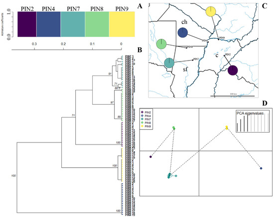 Genetic clusters inferred from ISSR in Paspalum intermedium populations. (A). Bayesian clustering of all individuals (K = 5). Bars represent individuals with the proportion of admixture in different colors. Light grey lines separate populations. (B). Unrooted UPGMA dendrogram constructed using Nei’s distance with 999 permutations. Only bootstrap values above 70 are shown. Color codes correspond with the DAPC legend (see D). (C). Geographical distribution of P. intermedium populations. Color codes in pie charts indicate the genetic composition (admixture coefficients) regarding the Bayesian clustering analysis of each population inferred from ISSRs (see A). (D). Discriminant analysis of principal coordinates of genetic variation. Lines represent the genetic distance of each individual from the centroid of each ellipse, and ellipses represent 95% dispersion of individual genetic variation from each population. Dashed lines connect populations that are more similar. c: Corrientes, ch: Chaco, sf: Santa Fe.