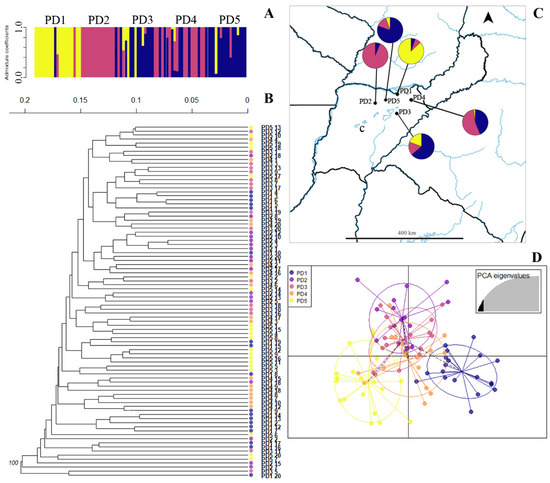For P. durifolium, a single high bootstrap cluster (100%) was recovered, with no preferential clustering among populations (Figure 4B). The k-means analysis also detected a single cluster for P. durifolium (Supplementary Data, Figure S3B). The structure analysis showed three distinctive clusters for P. durifolium (Figure 4A,C). Populations PD1 and PD2 showed low levels of admixture, while the other three populations showed intermediate levels of admixture and were composed mostly of one genetic cluster (Figure 4C). According to the DAPC, populations PD1 and PD5 are genetically different over PC1, and populations PD2-3-4 are genetically similar (Figure 4D).