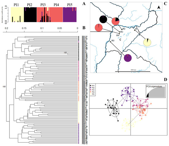 Five clusters with a high bootstrap value (>90%) were identified in the unrooted UPGMA dendrogram for P. intermedium, each corresponding to a unique population (Figure 3A). The k-means algorithm and structure analysis corroborated these five clusters (Supplementary Data, Figure S3A) with no genetic admixture among them (Figure 3B,C). This high population differentiation was confirmed by the DAPC, showing a clear separation among populations of P. intermedium (Figure 3D).