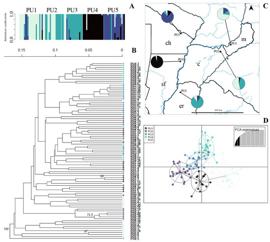 Genetic clusters inferred from ISSR in Paspalum urvillei populations. (A). Bayesian clustering of all individuals (K = 4). Bars represent individuals with the proportion of admixture in different colors. Light grey lines separate populations. (B). Unrooted UPGMA dendrogram constructed using Nei’s distance with 999 permutations. Only bootstrap values above 70 are shown. Color codes correspond with the DAPC legend (see D). (C). Geographical distribution of P. urvillei populations. Color codes in pie charts indicate the genetic composition (admixture coefficients) regarding the Bayesian clustering analysis of each population inferred from ISSRs (see A). (D). Discriminant analysis of principal coordinates of genetic variation. Lines represent the genetic distance of each individual from the centroid of each ellipse, and ellipses represent 95% dispersion of individual genetic variation from each population. Dashed lines connect populations that are more similar. c: Corrientes, ch: Chaco, er: Entre Rios, m: Misiones, sf: Santa Fe.