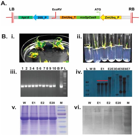 (A) rcoSpCas9 expression cassette and first round of plant transformation: LB/RB: T-DNA left and right border; hptII- Hygromycin coding sequence (CDS); 35S_P: Promoter of Cauliflower mosaic virus 35S gene; ZmUbq_T- Maize ubiquitin gene terminator, ZmUbq_P- Zea maiz Ubiquitin gene promoter rcoSpCas9- Rice codon-optimized Streptococcus pyrogens Cas9 CDS. (B) Development of stable lines and molecular confirmation of rcoSpCas9 expressing MTU1010 transgenic rice (i) and (ii): Regeneration and rooting of putative transgenic lines; (iii): 1–10 putative rcoSpCas9 transgenic lines confirmed through PCR; B: blank lane; P: pMDC99:rcoSpCas9 plasmid as positive control; L: 1 kb DNA ladder (GeneRuler) (iv): Southern blot analysis of PCR positive control lines; L: 1 kb DNA ladder (GeneRuler); W: wild type MTU1010 DNA as negative control; B: blank lane; E1–E20: PCR positive rcoSpCas9 lines (v): Coomassie-stained SDS-PAGE gel showing equal loading of total protein extracted from E1, E2, E20 and W lines. The gel serves as a loading control to confirm uniform protein quantities across lanes. (vi) Western blot analysis of the same gel, probed with an anti-Cas9 antibody, confirming the expression of rcoSpCas9 protein in the transgenic lines (E1, E2, and E20). The position of the Cas9 protein (~expected 160 kDa) and W: wild type MTU1010 total soluble protein as negative control, E1, E2, and E20: Southern positive rcoSpCas9 expressed lines; M- Protein ladder.