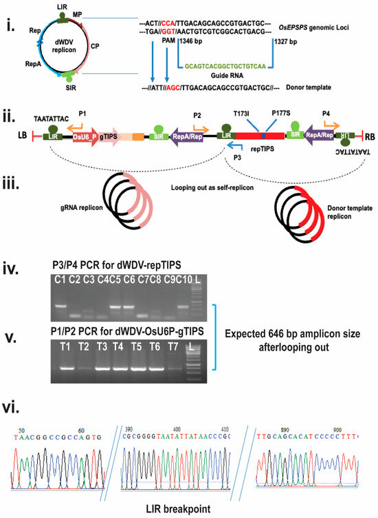 A wheat dwarf virus (WDV)-derived replicon system was developed to provide a persistent repair template for HDR. First, the WDV genome was linearized at the potential stem–loop region (TAATATTAT) of the long intergenic region (LIR) and, subsequently, the coat protein-encoding region was replaced with a selected rice EPSP synthase donor template (repTIPS/706 bp) harboring selective T173I/P177S substitutions. Essential viral replication components, such as the short intergenic region (SIR) and replication protein (Rep/RepA) (Figure 2, iii), were retained to maintain autonomous replication. The deconstructed WDV (dWDV)-based donor template delivery system (dWDV:repTIPS) was synthesized with all the necessary components and cloned into our lab-modified multi-gateway compatible entry vector (pL12R34-Ap) under EcoRI and SacI restriction sites. Similarly, a gRNA expression cassette under the rice U6 promoter and the pol-III terminator (dWDV: OsU6_P:gTIPS) was cloned into an entry vector (pL34R12-Cm-ccdB). Finally, the multi-round gateway cloning method was used to stack the components into the final plant transformation vector pMDC99:: dWDV:repTIPS:: dWDV:OsU6_P:gTIPS for transformation into a rcoSpCas9-expressing callus (Figure 2, ii and iii).