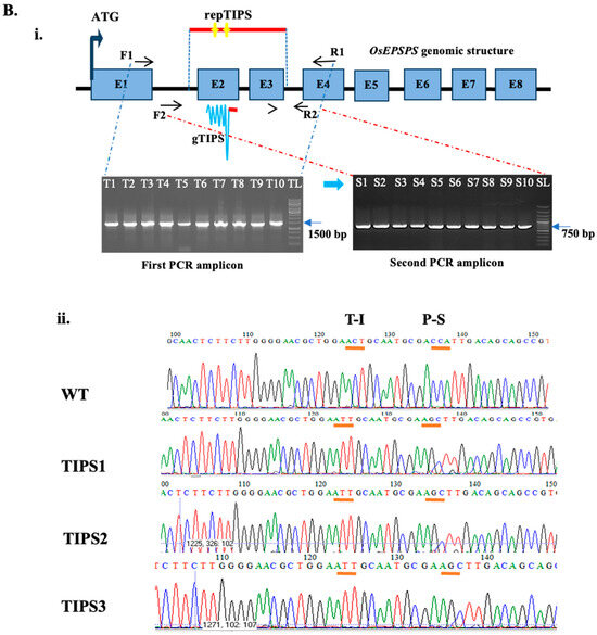 (A) Second round transformation under glyphosate selection using pMDC99:: dWDV:repTIPS:: dWDV:OsU6_P:gTIPS construct.: (i–iii). Callus induction under 35 mg/L hygromycin (iv–vi). First to third selection under 50 µmol/L glyphosate selection (vii–x). Regeneration under 25 µmol/L glyphosate selection. (B) Target amplification and mutation confirmation through sequencing and target site digestion (i). T1–T10—F1/R1 primer (first) PCR products, TL—GeneRuler 1kb DNA ladder; S1–S10—F2/R2 primer (second) PCR products, SL—GeneRuler 100 bp DNA ladder (ii). Sequencing confirmation of WT—MTU1010 control plant, TIPS1/2/3—OsEPSPS edited lines for T173I and P177S substitution.