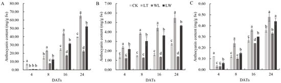 2.1. Anthocyanin Content in Different Parts of Eggplant at Seedling, Flowering, and Fruit Stages Under Low Temperature and Weak Light