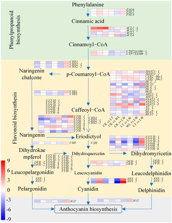Shen, B.; Wu, H.; Xie, X.; Zhao, B.; Chen, P.; Ao, D.; Pan, H.; Lin, B. Comparative Transcriptomic Analyses of Anthocyanin Biosynthesis Genes in Eggplant Under Low Temperature and Weak Light. Plants 2025, 14, 478. https://doi.org/10.3390/plants14030478