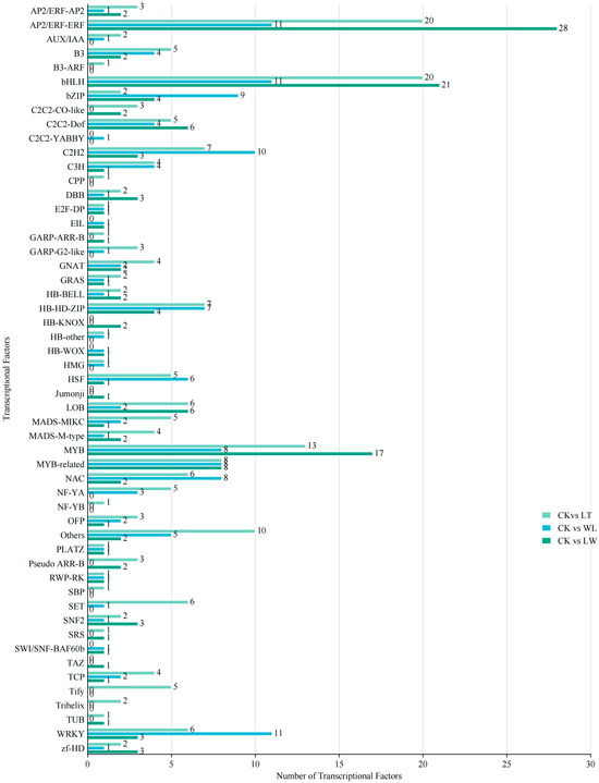 2.5. Identification of Transcriptional Factors Regulating Anthocyanin Biosynthesis in Eggplant Under Low Temperature and Weak Light
