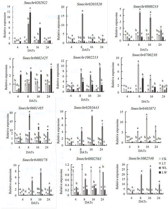 2.4. Expression Pattern of Anthocyanin Biosynthesis-Related Genes in Eggplant Under Low Temperature and Weak Light