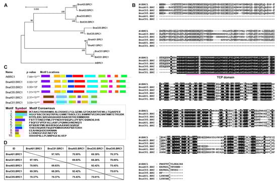 In order to further explore the role of BRC1 as a downstream of WRKY28 in rapeseed, we first analyzed the sequence of BRC1. Five paralogs of AtBRC1 were identified in the B. napus genome, located on chromosomes A01, A03, C01, C03, and C05, and named BnaA01.BRC1, BnaA03.BRC1, BnaC01.BRC1, BnaC03.BRC1, and BnaC05.BRC1, respectively. There were two paralogs of AtBRC1 in the B. rapa genome, named BraA01.BRC1 and BraA03.BRC1; however, there were three paralogs of AtBRC1 in the B. oleracea genome, named BolC01.BRC1, BolC03.BRC1, and BolC05.BRC1 (Figure 1A). About 7500 years ago, B. rapa and B. oleracea naturally hybridized to form B. napus, which inherits the A genome (A01–A10) and C genome (C01–C09) of B. rapa and B. oleracea, respectively []. Phylogenetic analyses revealed the evolutionary relationship of BRC1 in Brassica species. BnaA01.BRC1 and BraA01.BRC1 are on the same clade, BnaA03.BRC1 and BraA03.BRC1 are on the same clade, BnaC01.BRC1 and BolC01.BRC1 are on the same clade, BnaC03.BRC1 and BolC01.BRC3 are on the same clade, and BnaC05.BRC1 and BolC05.BRC1 are on the same clade (Figure 1A). These results indicate that the evolution of BRC1 follows the rule of genetic inheritance between subgenomes but exhibits asymmetric fragment duplication between subgenomes A and C. Sequence alignment showed that the five Brassica BRC1 copies, like AtBRC1, contained conserved TCP domains, but had poor conservation outside of the TCP domains (Figure 1B). Furthermore, the MEME website was used to predict the conserved motifs of these BRC1 proteins. BnaA03.BRC1, BnaC03.BRC1 and BnaC05.BRC1, like AtBRC1, all contained Motif 1–10 and had a quite consistent arrangement. The Motif composition and distribution of BnaA01.BRC1 and BnaC01.BRC1 were similar but differed significantly from AtBRC1. BnaA01.BRC1 and BnaC01.BRC1 only consisted of six motifs (Motif 1, 2, 3, 5, 6, and 8), without Motif 4 at the N-terminus, Motif 9 at the C-terminus, Motif 7 and 10 in the middle (Figure 1C). BnaA01.BRC1 and BnaC01.BRC1 shared 97.18% amino acid sequence identity; BnaA03.BRC1 and BnaC03.BRC1 shared 92.42% amino acid sequence identity. However, the identity between other pairs of BRC1 ranges from 68.26% to 75.61% (Figure 1D).