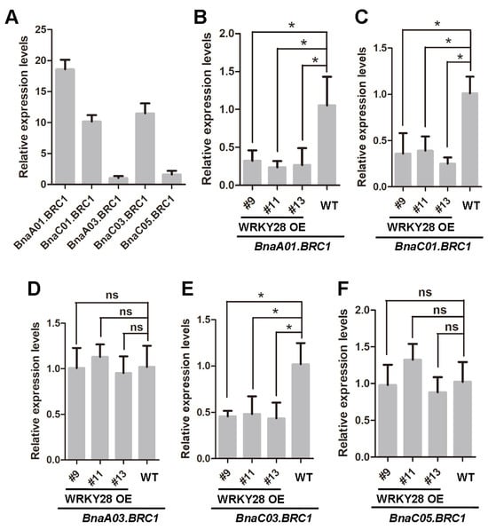 Expression analysis of five BRC1 copies of rapeseed in AMs of WT and WRKY28 OE lines. (A) Expression levels of BnaA01.BRC1, BnaC01.BRC1 BnaA03.BRC1, BnaC03.BRC1 and BnaC05.BRC1 in AMs of wild-type Westar. The mean values of BnaA03.BRC1 were used to normalize the expression levels. (B–F) Comparison of transcript abundance of BnaA01.BRC1 (B), BnaC01.BRC1 (C) BnaA03.BRC1 (D), BnaC03.BRC1 (E), and BnaC05.BRC1 (F) between WRKY28 OE lines and WT. #9, #11 and #13 are three representative BnaA03.WRKY28 overexpression (WRKY28 OE) lines. Data are shown as means ± SD (n = 3). Asterisks indicate significant differences compared with WT (t-test; ns, p > 0.05, * p < 0.05).