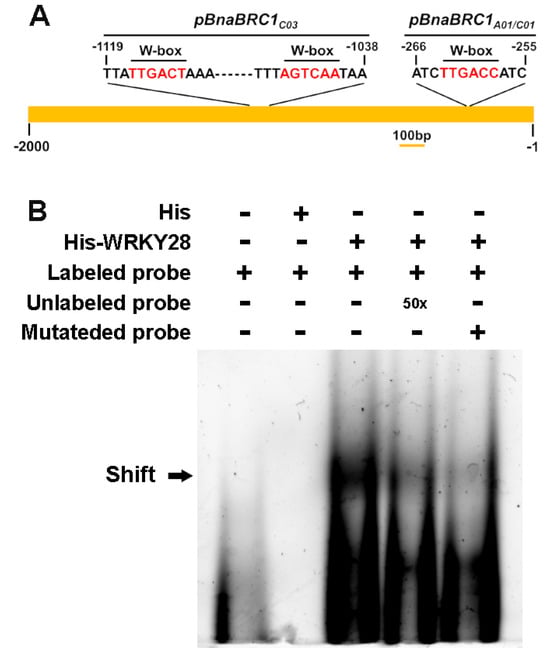 It is well documented that the WRKY TF regulates the expression of downstream genes by binding to the W-box cis-element with the core sequence T/CTGACC/T in the target gene promoter []. We analyzed the 2000 bp sequences upstream of start codon ATG of the five rapeseed BRC1 copies. The BnaA01.BRC1 and BnaC01.BRC1 copies were sequence conserved, both containing a typical W-box at approximately -260 bp. The BnaC03.BRC1 copy contained two typical W-boxes at approximately -1040 bp and -1115 bp. However, no W-boxes were found in the BnaA03.BRC1 and BnaC05.BRC1 copies (Figure 3A). We demonstrated that BnaA03.WRKY28 bound to the BnaC03.BRC1 promoter via the above-mentioned two W-boxes []. We expressed the BnaA03.WRKY28 protein through Escherichia coli and synthesized the probe containing W-box from BnaA01.BRC1/BnaC01.BRC1 promoter region for carrying out electrophoretic mobility shift assay (EMSA). The mutated probe (replacing a segment of TTGACC with AGAGAG) was synthesized as control. When the BnaA03.WRKY28 protein was added, the migration of the fluorescein-labeled probe was shifted dramatically, but not the mutated control probe (Figure 3B). This shifted band was completely weakened when the unlabeled probe was added (Figure 3B). These results indicate that BnaA03.WRKY28 directly binds to the promoter region of BnaA01.BRC1/BnaC01.BRC1.
