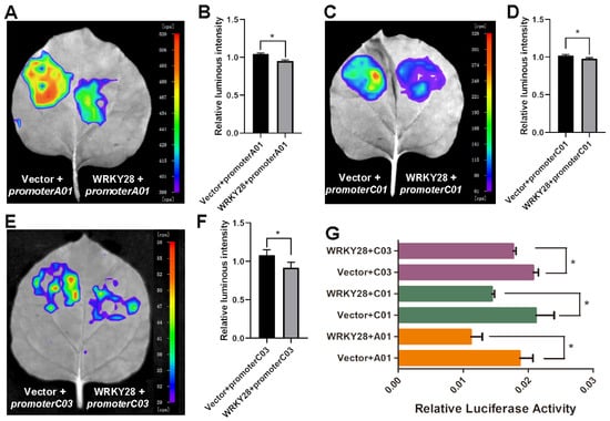 To test the effect of BnaA03.WRKY28 binding to the BnaA01.BRC1/BnaC01.BRC1/BnaC03.BRC1 promoter on the transcription of BnaA01.BRC1/BnaC01.BRC1/BnaC03.BRC1, we generated the effector (WRKY28) in which BnaA03.WRKY28 expression was driven by a CaMV 35S promoter and the reporters (promoter A01, promoter C01, and promoter C03) in which the promoter regions including W-boxes were fused to the firefly luciferase gene. The effector or control (vector without BnaA03.WRKY28) was cotransformed into tobacco leaves with promoter A01, promoter C01, or promoter C03, respectively. The fluorescence was weaker in the WRKY28 cotransformed with promoter A01 (Figure 4A,B,G), promoter C01 (Figure 4C,D,G), or promoter C03 (Figure 4E,F,G) than in controls, suggesting that BnaA03.WRKY28 could recognize the BnaA01.BRC1/BnaC01.BRC1/BnaC03.BRC1 promoter and inhibited its expression.