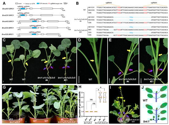 We designed sgRNA3 and sgRNA4 that could simultaneously target five BRC1 copies of rapeseed, and both guide RNAs were located within the TCP domain (Figure 5A). We obtained some CRISPR/Cas9-mediated homozygous editing lines, among which brc1-a1c1a3c3c5#4 and brc1-a1c1a3c5#21 (brc1 mutants) were used for subsequent research. In brc1-a1c1a3c3c5#4, a 34 bp fragment located between sgRNA3 and sgRNA4 was deleted on chromosomes A01, C01, A03, and C03, while no base edited on chromosome C05 (Figure 5B). In brc1-a1c1a3c5#21, the 34 bp fragment above mentioned was also deleted on chromosomes A01, C01, and C03, while on chromosomes A03 and C05, the 5 bp GACAT was deleted at the position sgRNA3 targeted (Figure 5B). During the vegetative stage when the plants were approximately six weeks old, we found significant differences in the number of axillary buds and branches between the brc1 mutants and WT. In WT, there was only one growth point on the apical meristem of the main stem (Figure 5C,D). However, in the brc1 mutants, axillary branches elongated from the main stem below the apical growth point. Each extra axillary branch had a growth point with normal growth and development ability, around which new leaves grow (Figure 5C,E,F). To confirm this phenotypic difference, we observed the shoot apical meristem of approximately four-week-old seedlings in paraffin sections. It was found that the axillary buds of the brc1 mutants had obvious outgrowth compared to WT (Figure S3). As the plants grew older, we conducted statistical analysis on the branches and growth points of WT, brc1 mutants, and brc1-a3c3 lines. The WT plants, as well as brc1-a3c3 lines, had only one growth point without an axillary branch, while the brc1 mutants had 3–5 growth points (Figure 5G,H), which subsequently formed excessive effective branching (Figure 5I). The significant increase in growth points in the brc1 mutants was due to the outgrowth of axillary buds below the growth point of the main stem. These results suggest that simultaneous mutation of BnaA01.BRC1, BnaC01.BRC1, BnaA03.BRC1, and BnaC03.BRC1 promotes axillary bud activity and shoot branching in rapeseed (Figure 5J).