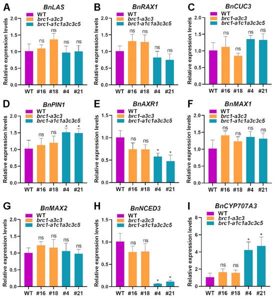 Expression analysis of genes related to branching in WT, the brc1 mutants, and brc1-a3c3 lines. (A–C) Genes involved in AM initiation. (D) Gene involved in auxin polarly transport. (E) Gene involved in cytokinin signal transduction. (F,G) Genes related to SL biosynthesis and signal transduction. (H) Gene involved in ABA biosynthesis. (I) Gene involved in ABA catabolism. Data are shown as means ± SD (n = 3). Asterisks indicate significant differences compared with WT (t-test; ns, p > 0.05, * p < 0.05).