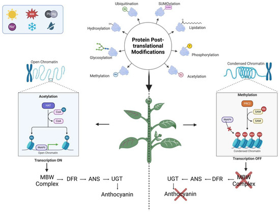 Abiotic factors trigger post-translational modifications (PTMs) in plants, influencing chromatin structure and gene expression. An example of anthocyanin biosynthesis is presented: on the left, acetylation (Ac) opens chromatin, allowing transcriptional activation of the MBW complex and downstream enzymes (DFR, ANS, UGT), leading to anthocyanin production. On the right, methylation (Me) condenses chromatin, inhibiting transcription of the same biosynthetic pathway, preventing anthocyanin accumulation. This highlights how PTMs, such as acetylation and methylation, regulate chromatin dynamics in response to environmental stimuli. Created in BioRender: https://BioRender.com/k98j551 (accessed on 2 December 2024).