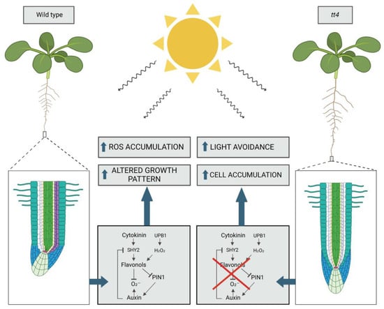 Metabolites as post-translational modification (PTM) effectors in root growth regulation. In wild-type plants, flavanols and anthocyanins regulate the balance between cell division and differentiation in root meristems. Light induces asymmetric accumulation of flavonols and anthocyanins on the exposed side (depicted in purple in the image on the left), promoting cell differentiation and limiting proliferation. This results in light avoidance by the roots, leading to reduced growth and a shift in the meristem away from the light source. Flavonols inhibit auxin polar transport mediated by PIN1 and scavenge the superoxide anion (O2−), contributing to the regulation of the boundary between the proliferative and differentiation zones. In the tt4 mutant, which does not produce anthocyanins, the light response is impaired. In the absence of anthocyanins, the roots do not asymmetrically accumulate flavonols and do not exhibit light avoidance. Consequently, the root growth in the tt4 mutant is greater compared to the wild type, with a regular zonation between cell proliferation and differentiation, as the roots do not limit growth in response to light. This highlights the importance of anthocyanins and flavonols inducing altered growth responses under light conditions. Created in BioRender: https://BioRender.com/p40c968 (accessed on 2 December 2024).