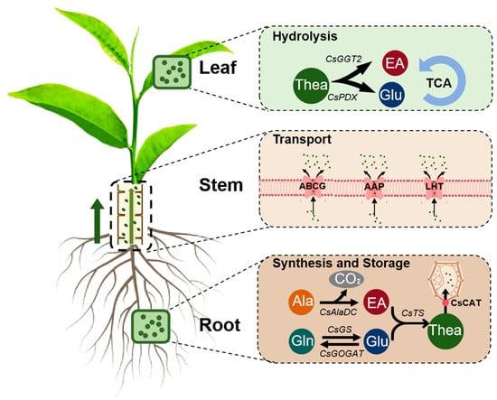 Tea (Camellia sinensis), as an important beverage cash crop, is renowned globally for its unique taste and nutritional value [1]. Commercial tea cultivation spans over 50 countries (China, India, Kenya, Sri Lanka, Turkey, Vietnam, and Indonesia lead as the top producers) [2]. Occupying 5 million hectares of land, tea plantations are predominantly found in China, which leads as the major producer with an annual output of 2.5 million tons. Following China are India (1.3 million tons), Kenya, and Sri Lanka. Together, these four nations account for 86% of the total global tea production [3]. Different types of tea possess distinct properties and benefits. Black tea, which is fully oxidized, has a bright red color and a rich aroma. It is known for its antioxidant properties, as well as its ability to warm the stomach, protect the liver, and safeguard cardiovascular health. Green tea, made from slightly oxidized leaves, is rich in amino acids and various vitamins. It offers anti-inflammatory effects, enhances immune function, and improves mental clarity. White tea, consisting of young leaves that have not yet been oxidized, retains the natural substances of fresh leaves and is associated with antioxidant, anticancer, and lipid-lowering effects [4,5]. L-theanine, a non-protein amino acid in tea, significantly influences tea flavor and plays a vital role in enhancing tea quality and promoting human health [6]. Clinical studies have demonstrated that L-theanine can enhance immune function, prevent influenza, and facilitate postoperative recovery. Extensive animal research has further revealed that L-theanine exerts immunomodulatory effects in inflammation, gastrointestinal health, and cancer prevention. It achieves this by boosting the body’s antioxidant capacity, promoting the synthesis of reduced glutathione (GSH). Additionally, L-theanine has been shown to increase stress resistance and immune function in animals. Moreover, L-theanine has been found to alleviate anxiety, lower blood pressure, improve cognitive function, and help relieve stress [7,8]. However, tea plants inevitably face various abiotic stresses, such as drought, salt stress, high as well as low temperature, light exposure, elevated CO2 concentration, and heavy metal contamination, which severely constrain tea production and quality [9]. In recent years, the escalating effects of global climate change and various environmental concerns have intensified abiotic stresses on the growth of tea plants, presenting unprecedented challenges for the tea industry [10]. To address these challenges, researchers have increasingly focused on the responses and mechanisms of tea plants to abiotic stresses, with particular attention being paid to the role of L-theanine metabolism [11]. The L-theanine metabolism is closely linked to stress resistance in tea plants and may serve as a strategy for adapting to environmental changes.