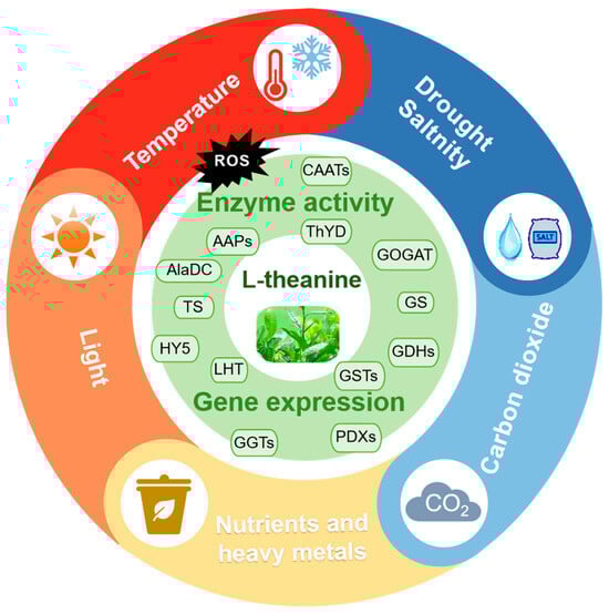 Initial studies primarily focused on the synthesis pathways of L-theanine, the identification of metabolic enzymes, and the regulation of gene expression [12,13]. However, the detailed mechanism by which the L-theanine metabolism is regulated in response to abiotic stress remains poorly understood. Recently, the development of molecular biology technology has enabled researchers to explore the relationship between the L-theanine metabolism and abiotic stress through genomics, transcriptomics, and metabolomics [14,15]. Numerous studies have confirmed that there are significant differences in theanine content among different tea plant varieties. These differences affect the quality of tea and are closely related to the stress resistance of tea plants. The theanine content is significantly positively correlated with the taste quality of tea, with high-theanine-content teas typically exhibiting superior freshness, such as the well-known albino mutant (Anji Baicha) [16]. Albino tea cultivars, characterized by their yellow or white leaf variations, were found to possess high concentrations of theanine [16]. Tea plant varieties with high theanine content show stronger stress resistance when facing adverse conditions. The current review emphasizes several key aspects related to the L-theanine metabolism under abiotic stress. First, it will discuss the changes in the synthesis, hydrolysis, and transport pathways of L-theanine in response to various abiotic stressors, including temperature fluctuations, moisture levels, salt stress, carbon dioxide concentration, light intensity, nutrient unavailability, and heavy metal exposure. Additionally, it will explore the regulation of key enzymes and genes involved in L-theanine metabolism during stress conditions, highlighting the roles of hormones and transcription factors in these processes. Furthermore, it will discuss the applications of L-theanine in other crops, highlighting its biological functions and potential benefits. Finally, we outline future research directions that could enhance our understanding of L-theanine’s role in plant stress responses and its applications in agriculture. This review aims to provide new perspectives on the resistance of tea plants to abiotic stress and to establish a theoretical foundation for understanding the response mechanisms of the L-theanine metabolism under abiotic stress, thereby fostering further research in this field.