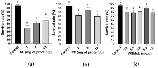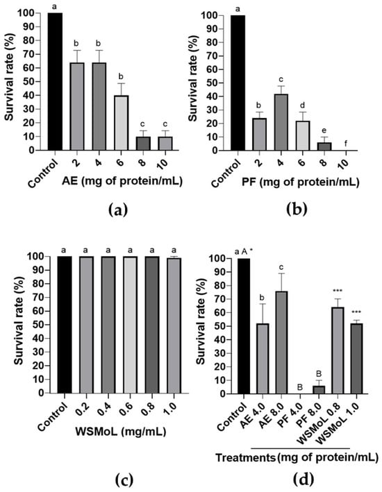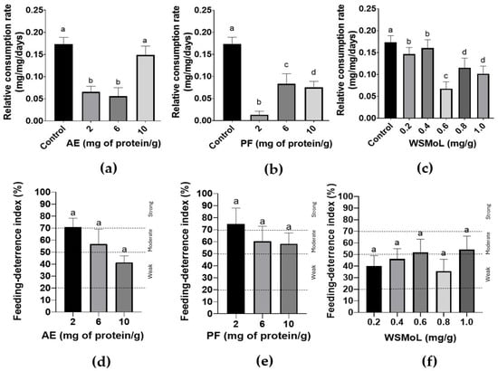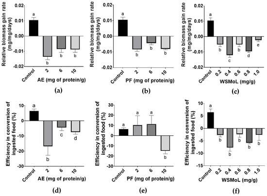 - Santos, N.D.L.; Albuquerque, L.P.; Amorim, M.M.R.; Silva, J.N.O.; Procópio, T.F.; Santos, P.É.M.; Paiva, P.M.G.; Barros, M.R.; Napoleão, T.H.; Pontual, E.V. Effects of Lectin Preparations from Microgramma vacciniifolia Rhizomes on the Survival, Digestive Enzymes, and Acetylcholinesterase Activity of Alphitobius diaperinus (Panzer) (Coleoptera: Tenebrionidae). Macromol 2023, 3, 451–462. [Google Scholar] [CrossRef]