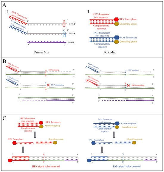 Workflow of KASP genotyping technology-based herbicide resistance detection. (A) (I) A Primer Mix consisting of two forward primers (HEX-F and FAM-F) with distinct terminal bases and one common reverse primer (Com-R). The 5′ ends of the two forward primers are respectively linked to different detection primer sequences. (II) PCR Mix containing two detection probes with distinct fluorescent labels. (B) The DNA template anneals with the matching primers from the Primer Mix, and during extension, the detection primer sequences are incorporated into the DNA. (C) The DNA strands containing the detection primer sequences specifically hybridize with the fluorescently labeled probes in the PCR Mix, leading to enhanced fluorescence signals after multiple rounds of PCR amplification.