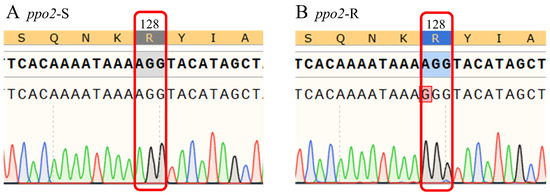 Amino acid mutation of the ppo2 gene in resistant populations. The partial sequence near the 128th amino acid site of the ppo2 gene in the sensitive population (A) and the resistant population (B).