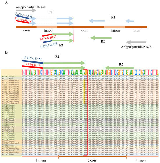 DNA sequence alignment for KASP primer optimization. (A) Schematic diagram of KASP primer optimization. By comparing the gene sequences of A. tricolor on NCBI (NC080059.1, positions 8666371–8678257), the initially designed KASP primers F1 and R1, based on A. retroflexus cDNA, were interrupted by introns. To address this issue, primers Ar/ppo/partialDNA/F and Ar/ppo/partialDNA/R were used to amplify a 700 bp fragment of the ppo2 gene from A. retroflexus, which includes site 128. Based on the alignment and consensus of that fragment, new KASP primers F2 and R2 were designed for following assays. (B) The partial ppo2 gene of A. retroflexus populations from different provinces is aligned with varying background colors. All resistant population individuals exhibited the same mutations.