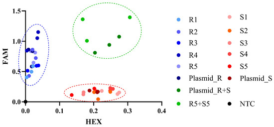 The KASP method was employed to detect each cDNA sample (Figure 1 and Figure 3A). The results in Figure 4 demonstrate that the data points representing samples R1, R2, R3, R4, R5, and Plasmid_R cluster near the FAM axis, whereas those for samples S1, S2, S3, S4, S5, and Plasmid_S cluster near the HEX axis. Samples R1 through R5 and Plasmid_R originate from resistant mutant populations, while samples S1 through S5 and Plasmid_S come from sensitive non-mutated populations. Additionally, the mixed samples Plasmid_R+S and R5+S5 combine Plasmid_S with Plasmid_R, and S5 with R5, respectively. These findings suggest that this technique can effectively differentiate between homozygous mutations at position 128 and heterozygous mutations in A. retroflexus cDNA, as well as distinguish them from non-mutated samples (Figure 4).