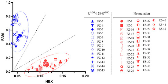 After reading the plate, the fluorescence signal intensity values for FAM, HEX, and ROX in each well were recorded; the data were imported into GraphPad Prism version 10 for processing and visualization as a scatter plot, which facilitated the determination of sample genotypes. FAM values were plotted on the Y-axis while HEX values were plotted on the X-axis. Normalization was performed using the ROX values from each well in the 96-well plate by dividing the FAM and HEX values by the corresponding ROX values, leading to tighter clustering of data points. cDNA samples sharing the same base at the mutation site will cluster together. Specifically, if only significant FAM fluorescence was detected without significant HEX fluorescence, it indicated that the measured cDNA sample was a homozygous mutant, clustering near the Y-axis (FAM axis). Conversely, if only significant HEX fluorescence was detected without significant FAM fluorescence, the measured cDNA sample was a homozygous wild-type, clustering near the X-axis (HEX axis). If both significant FAM and HEX fluorescence were detected simultaneously, it suggested that the tested cDNA sample was a heterozygous mutant, clustering in the central region between the axes.