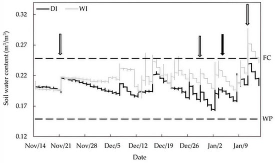 Volumetric soil water in well-irrigated (WI) and deficit-irrigated (DI) sweet cherry trees cv. ‘Regina’/Gisela 6. Field capacity (FC) and wilting point (WP) are shown in dotted lines. White arrows indicate measurement dates, while the black arrow shows the harvest time.