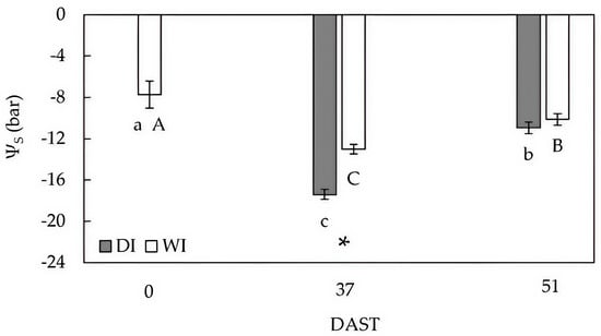Stem water potential (Ψs) in well-irrigated (WI) and deficit-irrigated (DI) sweet cherry cv. ‘Regina’/Gisela 6. DI trees were irrigated at 100% ETc for three days prior to measurements being performed at 51 DAST. Means and standard deviation are shown. Statistical differences in WI and DI at different DAST are indicated by capital and lowercase letters, respectively (Tukey test, p ≤ 0.05). The symbol * represents significant differences between treatments (Student t-test, p ≤ 0.05).