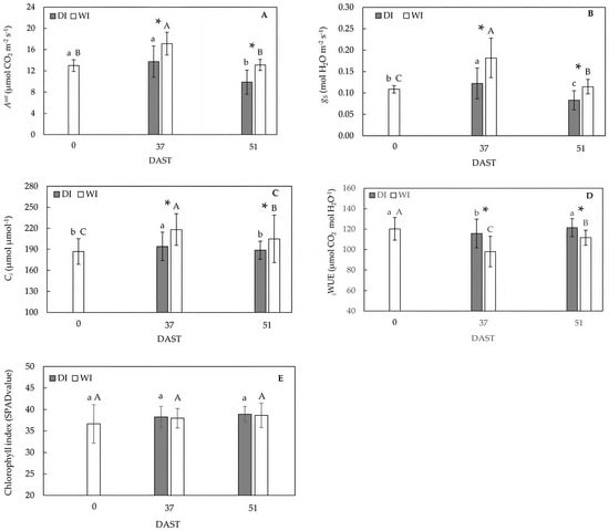 CO2 assimilation rate (Asat, (A)), stomatal conductance (gs (B)), intercellular CO2 concentration (Ci, (C)), intrinsic water use efficiency (iWUE, (D)) and chlorophyll index (E) in well-irrigated (WI) and deficit-irrigated (DI) sweet cherry cv. ‘Regina’/Gisela 6. DI trees were irrigated at 100% ETc for three days prior to measurements at 51 DAST. Means and standard deviation are shown. Statistical differences in WI and DI at different DAST are indicated by capital and lowercase letters, respectively (two-to-two Dwass–Steel–Critchlow–Fligner comparisons, p ≤ 0.05). The symbol * represents significant differences between treatments (Mann–Whitney U test, p ≤ 0.05).