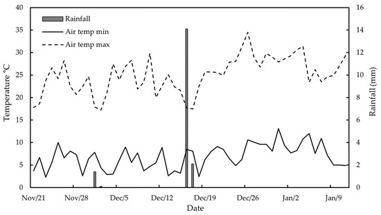 The ETC was calculated following FAO 56, with crop coefficients obtained from the literature and reference evapotranspiration from the Gaby Ranquilco-INIA automatic weather station located 4 km from the experimental site (https://agrometeorologia.cl). Plants were irrigated with two drip lines on each row, with emitters spaced at 70 cm intervals along the lines. The emitter flow rate was 4.5 L/h for WI, which was then adjusted to 2.5 L/h for DI. Depending on demand, a two- or three-day irrigation frequency was used. During the experiment, three precipitation events were recorded, accumulating 17.7 mm. Rainfall and mean temperatures are shown in Figure 4.