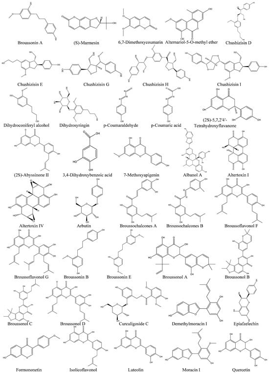 Broussonetia papyrifera (L.) L’Hér. ex Vent. research indicates that B. papyrifera is native to China as well as subtropical regions of Southeast and East Asia. Prehistoric voyagers introduced approximately 70 species of plants to Polynesia. However, only a limited number of these plants made it to the islands of Easter Island, Hawaii, or New Zealand, with B. papyrifera being one of them []. B. papyrifera is a versatile tree with medicinal, edible, and feeding applications. Owing to the abundance of nutrients and active ingredients found in B. papyrifera, it is highly desirable for use in food and medicinal purposes. Specifically, the leaves of B. papyrifera are rich in various amino acids, making them an unconventional but valuable feed source for animals []. The cellulose-rich composition of the endodermis of the tree’s bark also makes it a premium raw material for paper production. Furthermore, B. papyrifera contains various bioactive compounds, including amino acids, polysaccharides, and proteins, as well as flavonoids, phenylpropanoids, and other polyphenolic compounds. Extensive pharmacological studies have demonstrated that the flavone glycosides and total flavonoids found in B. papyrifera can inhibit atrial contraction and protect human epidermal cells from oxidative damage caused by exposure to lead and arsenic []. Additionally, extracts from B. papyrifera possess properties such as heat clearance, detoxification [], blood cooling, diuresis, liver cleansing, and vision improvement []. The leaves, in particular, contain high concentrations of glycosides, diterpenes, flavonoids, and lactones, all of which exhibit potent bioactivity []. The bark, leaves, and roots of B. papyrifera can be used to treat arthritis [], promote wound healing and reduce skin infections, treat diarrhea [], protect the liver [], regulate blood sugar [], respiratory tract infections and whiten skin []. Moreover, various secondary substances are present in fruits, roots, bark, and other parts of the B. papyrifera, making it a highly valuable resource. Owing to its rich nutritional and medicinal components, B. papyrifera has attracted increasing attention in recent years, leading to significant advancements in research in this field.