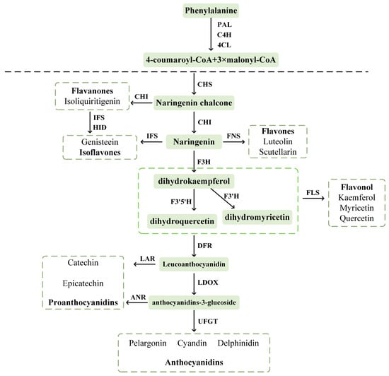 Schematic diagram of flavonoid metabolic pathway. Abbreviations: PAL, phenylalanine ammonia-lyase; C4H, cinnamic acid 4-hydroxylase; 4CL, 4-coumarate CoA ligase; CHS, chalcone synthase; CHI, chalcone isomerase; IFS, isoflavone synthase; FNS, flavone synthase; F3H, flavanone 3-hydroxylase; F3′H, flavonoid 3′-hydroxylase; F3′5′H, flavanone 3′,5′-hydroxylase; FLS, flavonol synthase; DFR, dihydroflavonol-4-reductase; LAR, leucoanthocyanidin reductase; LDOX, leucoanthocyanidin dioxygenase; ANR, anthocyanidin reductase; UFGT, uridine diphosphate-glucose: flavonoid 3-O-glucosyltransferase.