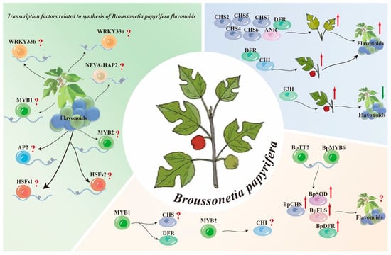 Extensive research has been conducted on Moraceae plants to understand the regulation of flavonoid synthesis by transcription factors. It has been reported that in Morus alba L., MaMYB4 positively regulates FLS and negatively regulates ANS []. In mulberry, MnMYBJ and MnMYB4 negatively regulate anthocyanin biosynthesis, whereas MnMYB330 functions as a positive regulator. These findings highlight the multifaceted regulatory functions of MYB transcription factors in flavonoid pathways across various species. By overexpressing BpTT2 and BpMYB6 in B. papyrifera, the transcription of downstream BpCHS1 and BpDFR1 is effectively increased, resulting in improved antioxidant enzyme activity and increased accumulation of polyphenolic compounds in the plant []. Eight transcription factors, including two MYB transcription factors, MYB1 and MYB2, associated with DFR, CHS, and CHI, respectively, were identified from two key modules closely linked to flavonoids. Furthermore, high expression of the B. papyrifera DFR and CHI genes promoted flavonoid accumulation, whereas inhibiting the expression of F3H genes increased flavonoid synthesis. Coexpression network analysis revealed that eight transcription factors (HSFs1 and AP2) are related to B. papyrifera flavonoid synthesis. However, knowledge regarding flavonoid synthesis genes in B. papyrifera is limited, with relevant studies showing significant expansion of only four key enzyme families, including CHS and DFR, in the flavonoid synthesis pathway [] (Figure 3).
