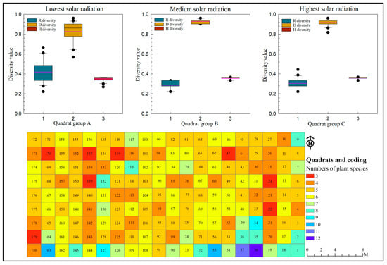 To investigate the impact of solar radiation on plant diversity, this study selected 60 sample plots from a total of 180 based on simulated solar radiation values. These plots were then categorized into three groups—Group A, Group B, and Group C—corresponding to the lowest, medium, and highest levels of solar radiation intensity, respectively. Detailed information is provided in Tables S2–S4 in the Supplementary Materials.
