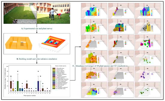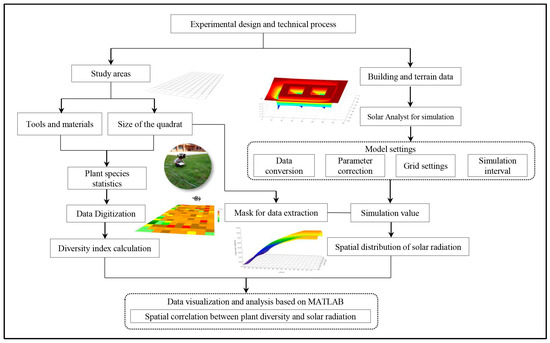 Based on the characteristics of the experimental site, as well as the materials, tools, and techniques utilized, the experimental design and research process are organized into several key steps. These include the establishment of study quadrats and the selection of appropriate tools for data collection, followed by the preparation of building and terrain data, the generation of vector models, and the simulation of solar radiation. The next step involves processing plant species and solar radiation data, which includes digitization and integration through GIS to assess the spatial distribution of plant species and their correlation with solar radiation. Finally, data calculation and visualization analysis are performed. A detailed overview of the research process is presented in Figure 6.