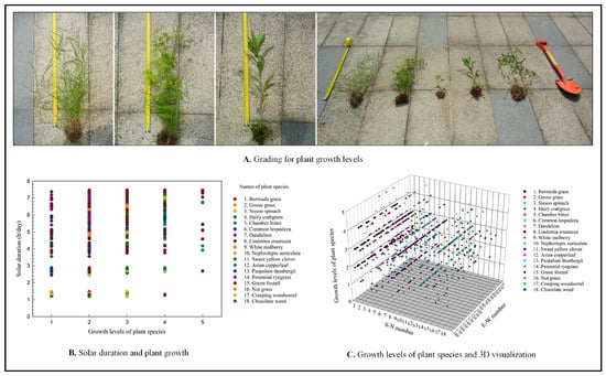 The same plant species, such as Goose grass, Common lespedeza, Dandelion, Lindernia crustacea, and Mulberry, show no significant correlation between sunshine duration and growth levels (Figure S3). However, the distribution of Mulberry across quadrats appears random, making it challenging to determine whether this pattern is consistent in other areas of the city. In contrast, the analysis revealed a weak negative correlation between the growth level of Chamber bitter and sunshine duration in this study area. This plant is a shade-loving species, and its sunlight requirements align with the observed results.