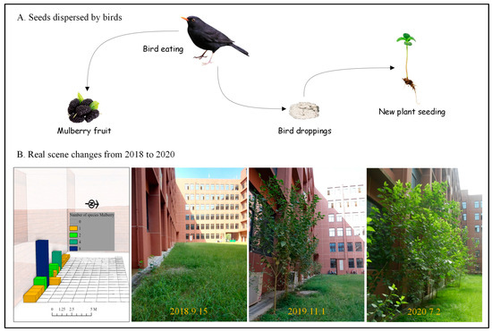 Bird-driven plant species distribution: (A) transmission route and (B) changes in real scene from 2018 to 2020.