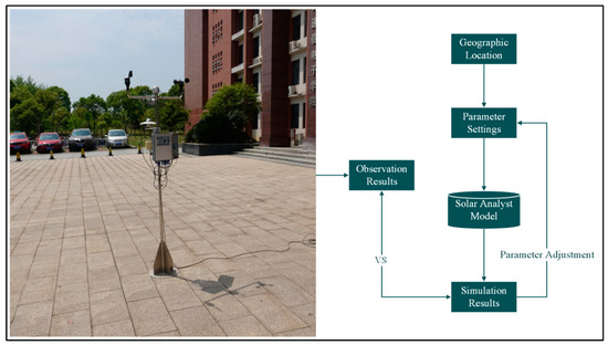 To ensure the accuracy of the simulation results in Nanchang, model calibration was performed using instrumental measurements from open test sites. The radiometer module of the Microclimate Environment Test Systems (No. JRT13) was used to measure solar radiation, which was then used to adjust the model’s output (Figure 5). The calibration formula is as follows [40]: