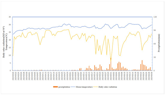 The experiment was conducted from April to August 2024 at the experimental base of the National Salt-Tolerance Rice Technology Innovation Center, Leyi Village, Hainan Province, China (108.90′ E, 18.44′ N). The average daily temperature throughout the entire growth period was 28.2 °C, and the total rainfall was 380.7 mm. The average daily solar radiation was 21.3 MJ m−2d−1 (Figure 1). The initial soil salinity level was around 0.2%. The basic physicochemical properties of the soil were as follows: total nitrogen 0.3 g kg −1, available nitrogen 78.5 mg kg−1, total potassium 6.2 g kg−1, and available potassium 78.5 mg kg−1. The seedlings salt-tolerant rice variety ‘Shuangliangyou 138′ was transplanted at the three-leaf and one-heart stage with a 20 × 20 cm row spacing. The fertilizer treatments, i.e., N1: urea, N2: slow-release urea, and N0: no N fertilizer, and soil amendments, i.e., S1: zeolite amendment, S2: coconut coir amendment, S3: humic acid amendment, and S0: no amendment, were kept in main plots and sub-plots, respectively, in a split-plot design. The structural properties of the soil amendments provided for the test were as follows: zeolite: SiO2 = 67.1%; Al3O3 = 11.8%; moisture = 8.5% (supplied by Hebei Shijiazhuang JingSen Mineral Co., Ltd., Shijiazhuang, China); humic acid with free humic acid on dry basis = 51.4%; moisture = 7.7%; pH: 10.3 (supplied by Inner Mongolia Delang Biological Co., Inner Mongolia, Ltd., Inner Mongolia, China); coconut coir: pH = 5.1; total N: 7.1%; total phosphorus: 0.3%; total potassium: 3.4% (supplied by Sanya Sanliyuan Coconut Coir Company, Sanya, China). The fertilizers used were slow-release urea and conventional urea with a N content of 44 and 46%, respectively. The slow-release urea was resin-coated slow-release urea and the slow-release period was 90 days.