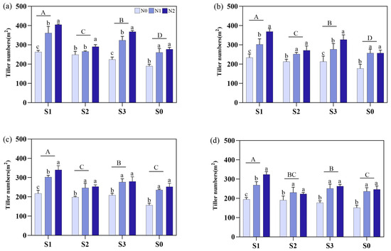 Effects of different soil amendments and different nitrogen sources on tiller square meters in different growth stages under salt stress. (a) represents the mid-tillering stage, (b) represents the panicle initiation stage, (c) represents the heading stage, and (d) represents the mature stage. N1: urea, N2: slow-release urea, N0: no nitrogen fertilizer; S1: zeolite amendment, S2: coconut coir amendment, S3: humic acid amendment, S0: no amendment. Different lowercase letters indicate significant differences between different nitrogen fertilizers under the same soil amendment, and different uppercase letters indicate significant differences among different soil amendments.