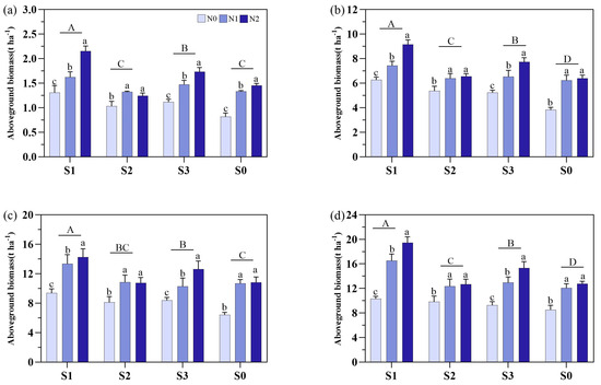 Effects of based different soil amendments of different nitrogen sources on aboveground biomass in different growth stages under salt stress. Notes: (a) represents the mid-tillering stage, (b) represents the panicle initiation stage, (c) represents the heading stage, and (d) represents the mature stage. N1: urea, N2: slow-release urea, N0: no nitrogen fertilizer; S1: zeolite amendment, S2: coconut coir amendment, S3: humic acid amendment, S0: no amendment. Different lowercase letters indicate significant differences between different nitrogen fertilizers under the same soil amendment, and different uppercase letters indicate significant differences among different soil amendments.