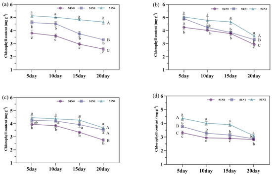 Effects of different soil amendments and different nitrogen sources on chlorophyll at 5 days, 10 days, 15 days, and 20 days after the heading stage under salt stress. Notes: (a) represents zeolite amendment, (b) represents coconut coir amendment, (c) represents humic acid amendment, and (d) represents no amendment. N1: urea, N2: slow-release urea, N0: no nitrogen fertilizer; S1: zeolite amendment, S2: coconut coir amendment, S3: humic acid amendment, S0: no amendment. Different lowercase letters indicate significant differences among different nitrogen fertilizers at the same time for the same amendment, and different uppercase letters indicate significant differences over all times for the same amendment with different nitrogen fertilizers.